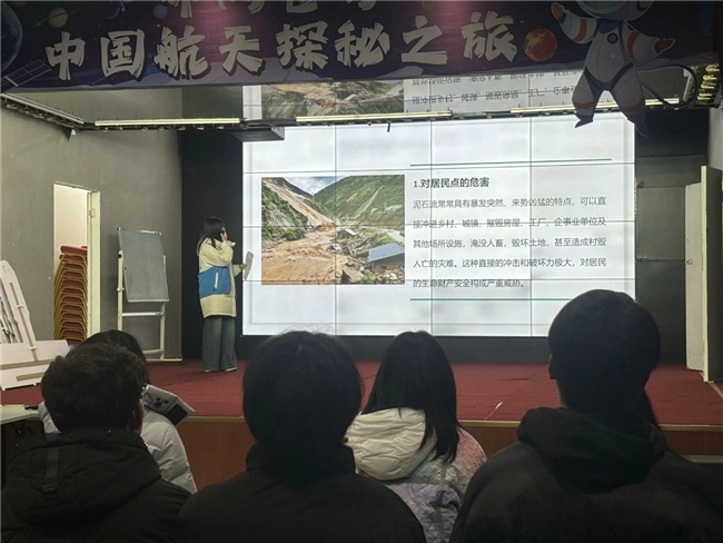 地处四川盆地边缘的雅安,地质构造活跃、地形起伏显著,每逢汛期暴雨频发。针对这一地域特点,实践团队运用地质模型与三维影像的数字动画演示,直观展示泥石流形成机理。“大家看这个分层模型,当强降雨渗透松散岩土层……”讲解员通过通俗易懂的演示,系统解析地形陡峭度、土壤含水率、植被固土能力等关键因素,帮助居民建立科学认知体系。