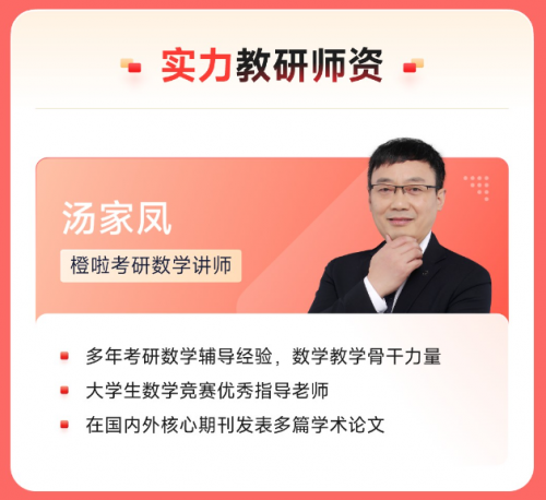 师资力量是这门课程的一大优势。汤家凤老师作为橙啦考研数学讲师,他拥有多年考研数学辅导经验,是数学教学骨干力量。在教学过程中,他凭借丰富的经验,能精准把握考研数学的重点和难点,将复杂的知识点讲解得通俗易懂。汤老师还是大学生数学竞赛优秀指导老师,在国内外核心期刊发表多篇学术论文,深厚的学术造诣为教学提供了坚实的理论支撑。他独特的教学方法深受学生喜爱,帮助众多考生在考研数学中取得优异成绩。