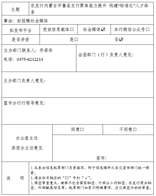 农发行内蒙古开鲁县支行以“持证上岗”为抓手,严格遵循运营专业上岗准入工作方案,全行共计6名员工参加学习并通过运营管理专业资格认定考试,确保员工“人人过关、岗岗精通”。