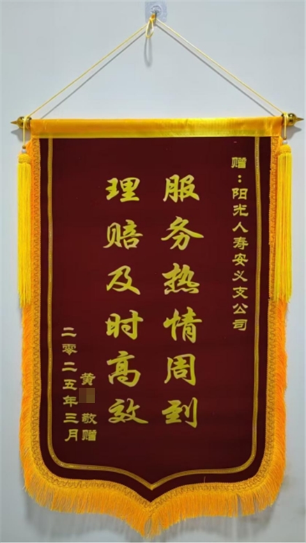 3月5日,阳光人寿江西分公司安义支公司收到了一份来自外地的特殊礼物——一面锦旗。这面锦旗承载着客户黄女士对阳光人寿的感激之情,也见证了阳光人寿高效、温暖的理赔服务。