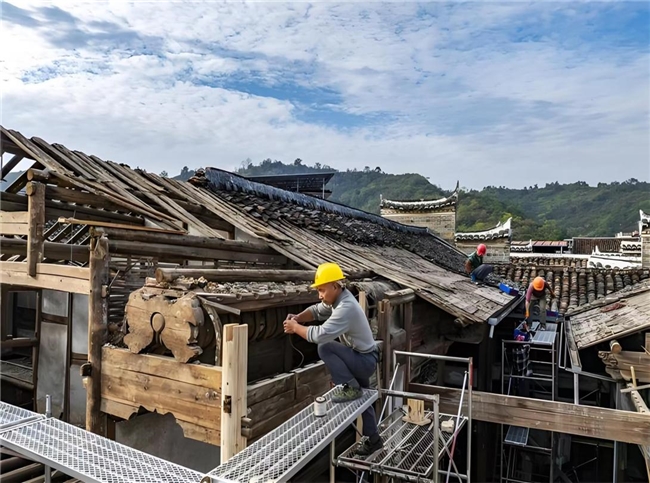图为宜章县和美乡村项目(一期)修缮建设现场