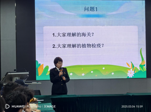 讲座中,陈好娟老师从海关的核心职能出发,结合植物检疫工作实际,深入剖析了海关在维护国家生物安全、防控外来有害生物入侵中的关键作用。她通过典型案例分析,向同学们展示了海关日常工作中如何严格把关进出口货物、邮寄物品的检疫流程,以及发现病虫害或违规物品时的规范化处置程序。她强调:“海关是守护国门的第一道防线,每一份严谨的检疫报告,都是对国家生态安全和人民健康的一份承诺”。