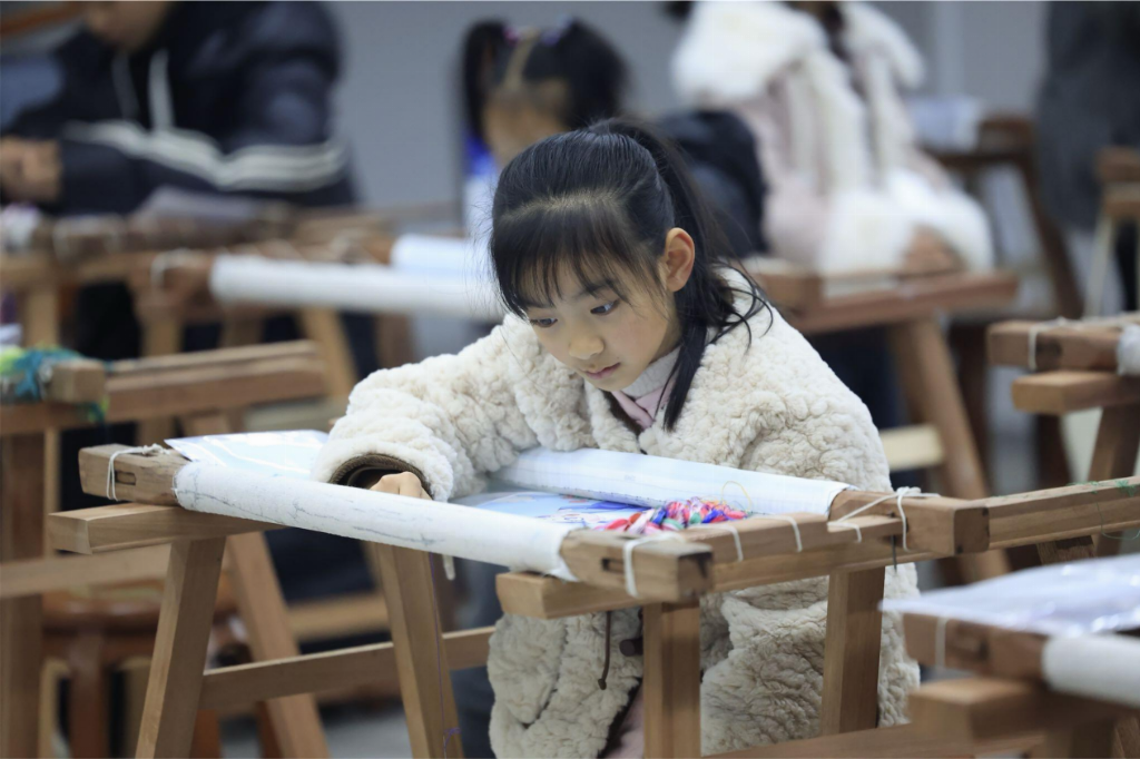 团队成员在现场观察到,学生们围坐在刺绣架前,聚精会神地跟随教师示范,在绣布上进行练习。教师表示,学习刺绣不仅可以锻炼学生的耐心和动手能力,更是非遗文化传承的重要途径。然而,她也提到,尽管嫁花刺绣已被纳入文化宫的教学体系,但愿意深入学习并坚持完成刺绣训练的学生仍较少,如何增强青少年对传统工艺的兴趣,仍然是目前面临的难题之一。