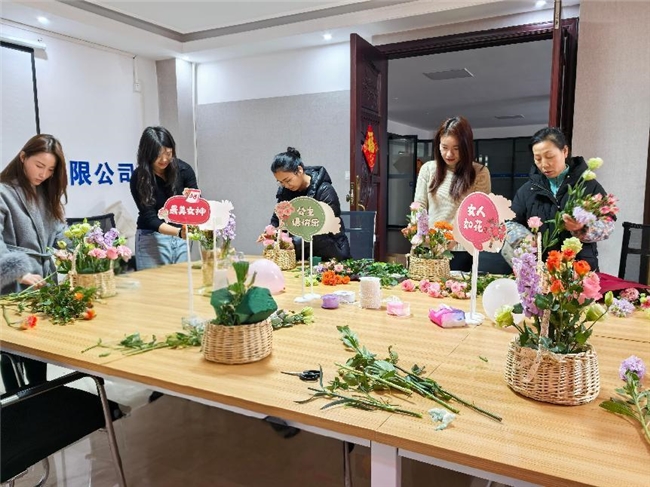 项目团队早早筹备,为女职工们准备了实用又贴心的节日礼物,承载着对她们辛勤付出的感恩。插花活动现场更是充满温馨浪漫的氛围,花香四溢。亲手修剪花枝、搭配色彩,将原本普通的花材变成了一件件独具匠心的花艺作品。