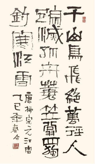 “金石气”的当代诠释:汲取青铜器铭文铸刻的凝重感与石刻文字的斑驳感,运笔中融入提按、顿挫、涩行等变化,线条在圆润流畅之外更显苍茫朴厚、力透纸背,超越了单一匀净的铁线篆模式。