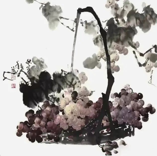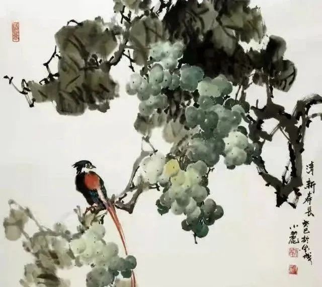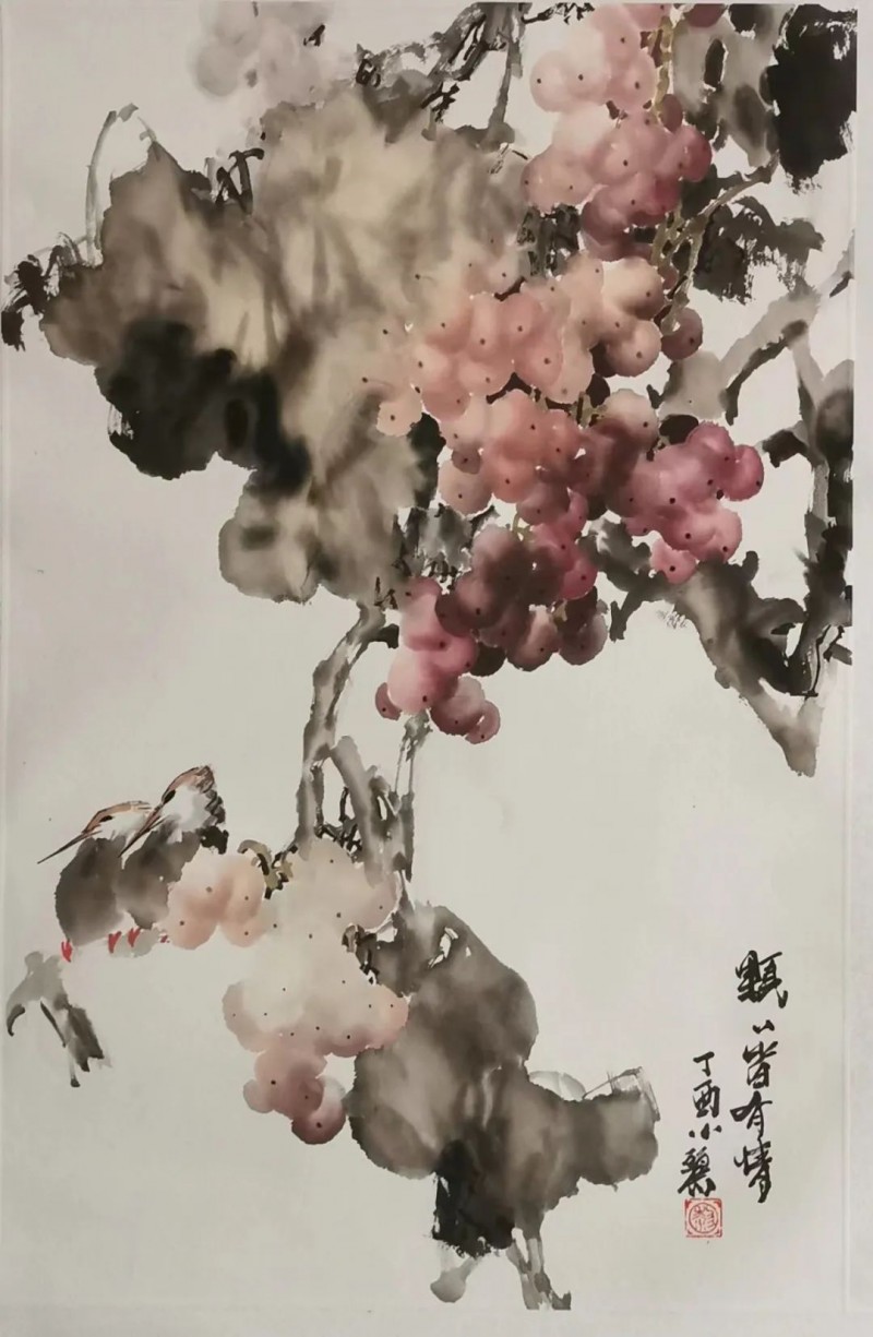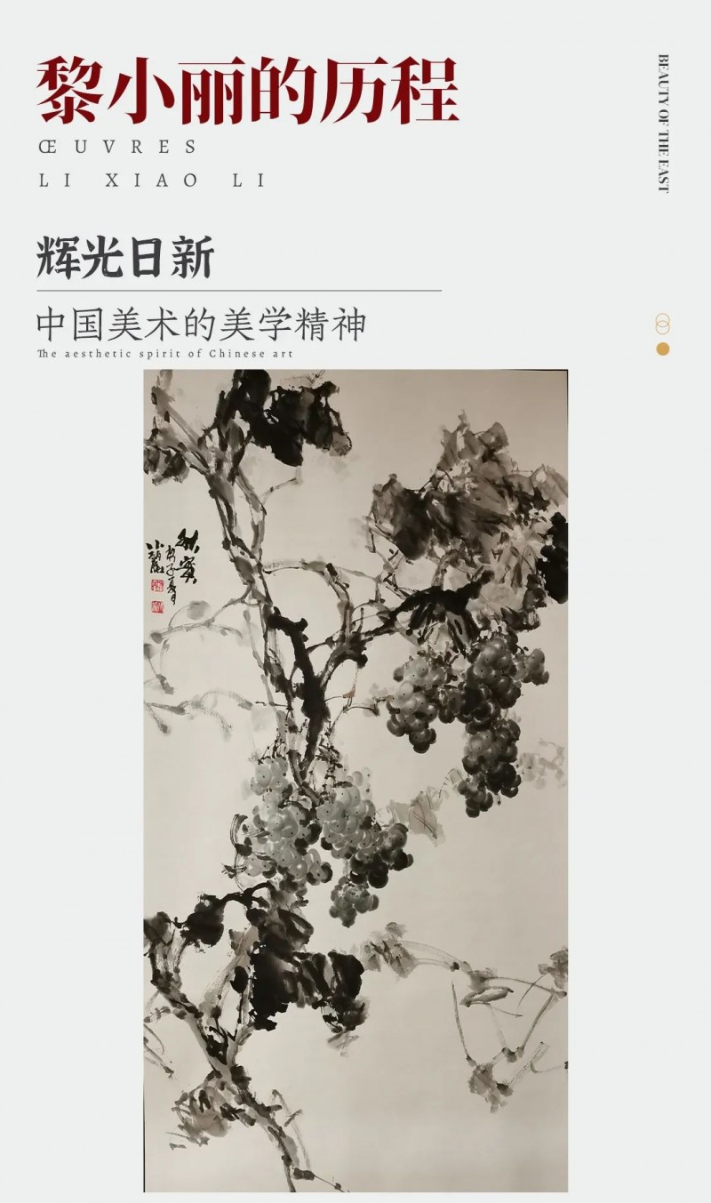 黎小丽笔下的葡萄,如“秋实图”、“醉秋风”、“绿叶深处半露面”、“遥看银河满天星”、“子满架”等等,都给人一种清新扑面的美感,使这原本的俗物变得高贵典雅,并赋予它种种深刻的文化内涵,赋于它灵魂,赋于它生命,它似乎在赞美着秋天收获的喜悦,赞美着生活的甜美和大自然给人们的恩赐和一种乐于奉献的品格。