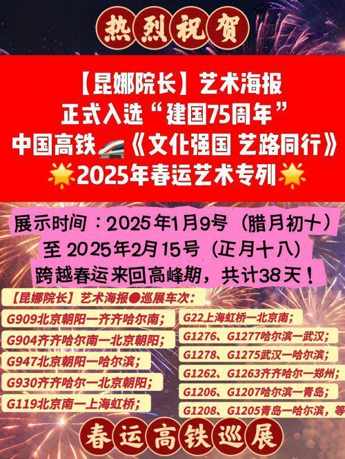 昆娜院长个人先进事迹,入选2025年中国国家铁路集团“名家贺新春 高铁专列巡展”,在春运黄金段一个半月期间,面向全球旅客,在高铁展出。
