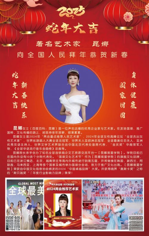 昆娜女士(百度百科/抖音百科搜索:昆娜)是一位声名远播的优秀企业家与艺术家。在传承文化,发扬国潮,文化出海的路上,她以国家民族大任为己任,在推广国潮文化的艺术之路,坚持多年深耕,硕果累累,深受海内外各界支持与厚爱。