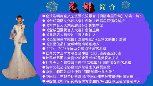 昆娜女士,创建了全球连锁商企文艺资源一体化服务平台——【昆娜宸星学院】及国际文化品牌——《世界名人艺术家联合会》。