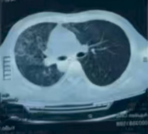 病人感觉医院治疗效果不明显,越来越重,不能下床。吸最高浓度氧,仍有呼吸困难。同时对医院的常规用药,胃肠道反应太重,无法耐受,于是找到杨玉山医生诊治。杨医生当天通过“独特药物配方+第三途径给药(把药直接注入病灶内)”的“微创靶向综合疗法技术”,为病人进行肺穿刺打针给药,一天一针,连续5天共5针;同时,每天静脉推注2次共10次;第6天,因病人手上还有真菌感染,便又在两腋窝处各打1针;肺穿第二天,就可以吸低浓度的氧了。第三天,就可以下床了。第四天,就可以间断地停氧。第10天,停止吸氧。新冠肺炎被彻底治好。第12天回家康复修养。回家后第十天开始跑步。一个月后,每天跑三次,每次5公里,身体康复良好,越来越好。