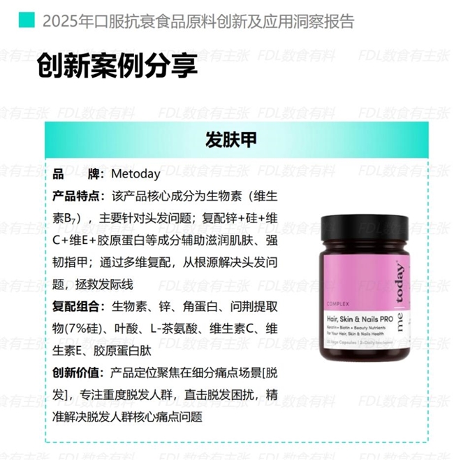 在健康老龄化成为社会大背景的当下,消费者对于抗衰的需求已不再满足于表面的修饰,而是深入到“由内而外”的科学抗衰层面。metoday凭借对市场的敏锐洞察和不懈创新,在口服抗衰领域脱颖而出,两款明星产品1218 打光瓶虾青素与发肤甲分别荣获口服抗衰产品力创新认证及入选抗衰行业白皮书原料研发创新案例,成为行业瞩目的焦点。