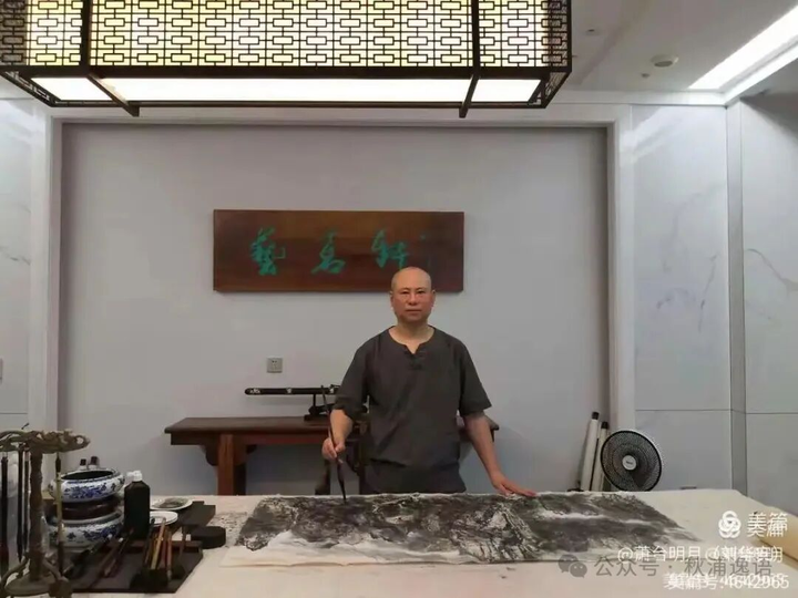 北宋韩拙在«山水纯全集»云:“笔以立其势,墨以分阴阳”,中国画亦讲究笔墨技巧,尤中笔势与体势,山亦苍苍,水亦茫茫,何以现之?唯有笔墨也。刘华安的山水,强调用笔的主导,骨法用笔,一幅画中,见笔见墨,水墨兼容,干湿得宜。华安作画,喜长锋散锋用笔,大笔如橼,长锋横扫,气势如宏,力可抗鼎。