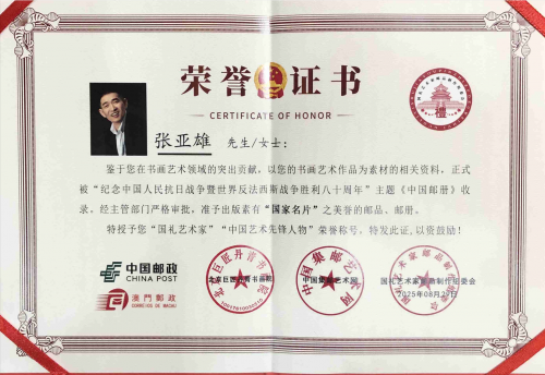 2025年8月 张亚雄玉雕作品正式被“伟大胜利--纪念中国人民抗日战争暨世界反法西斯胜利80周年”主题邮票、邮品收录。经中国邮政部门严格审批,准予全国出版发行素有“国家名片”之美誉的邮票、邮品、邮册。