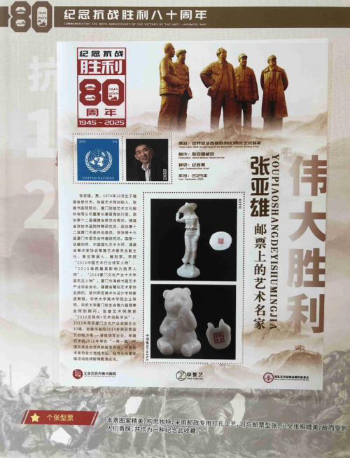 2025年8月29日张亚雄玉雕作品正式被“伟大胜利--纪念中国人民抗日战争暨世界反法西斯胜利80周年”主题邮票、邮品收录。经中国邮政部门严格审批,准予全国出版发行素有“国家名片”之美誉的邮票、邮品、邮册。