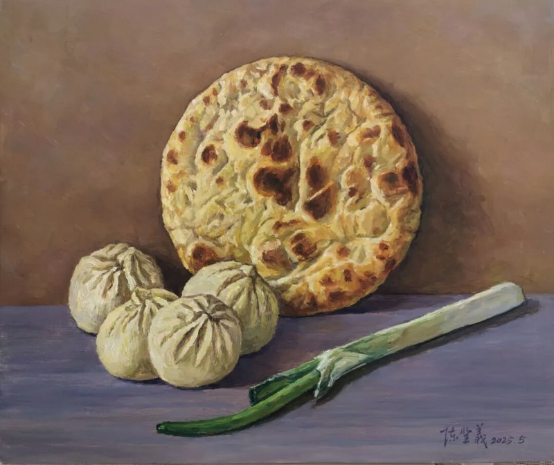 陈登义的静物画创作,构思新颖,意趣生动,色彩鲜明,雅静中倾注着亲情的纯真和年华的回味。他的记忆深处刻印着种瓜能手老父亲的身影,选材表现兰州籽瓜,着意刻画,将久蓄胸臆的父子深情释放在鲜亮细微的笔触中。陈登义视母亲留念的件件刺绣剪纸为艺术珍品,精心组合构成画面的重彩亮点,意蕴深深,乡味浓浓。那精致的虎头鞋、香荷包,满盘喜礼的莲花卷,衬铺着印花桌布,使人耳目一亮,仿佛听到了一个小生命诞生的清脆哭声和高朋盈门的贺喜声。腌菜的大缸小坛,锅碗瓢盆,瓜果蔬菜,这些农家生活用品,五味杂陈,是母亲勤俭持家的见证,在陈登义彩笔下描绘出温馨的美感,提升到朴实、清贫、无欲则安的境界。