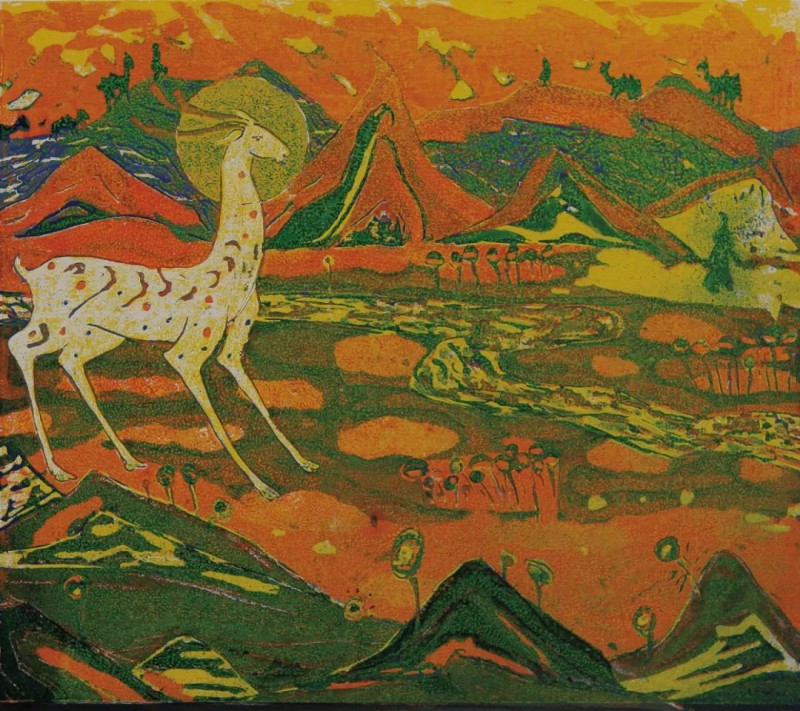 移步换景,背后的山峦恰似打翻的神祇调色盘。橙色如燃烧的火焰,沿着起伏的山脊肆意蔓延;绿色似涌动的生命汁液,灌注进每一道沟壑;蓝色仿若深邃的天幕碎片,镶嵌在崇山峻岭之间。诸般色彩相互交织、碰撞,没有丝毫妥协与迁就,以一种近乎野蛮的力量感堆叠出层次分明却又混沌初开的壮阔景象。此起彼伏的山峰轮廓,恰似大地跳动的脉搏,诉说着岁月沉淀下的雄浑故事,也在无声地回应着白鹿遥望的目光,二者相隔咫尺,却仿佛横跨时空,进行着一场亘古未有的对话。