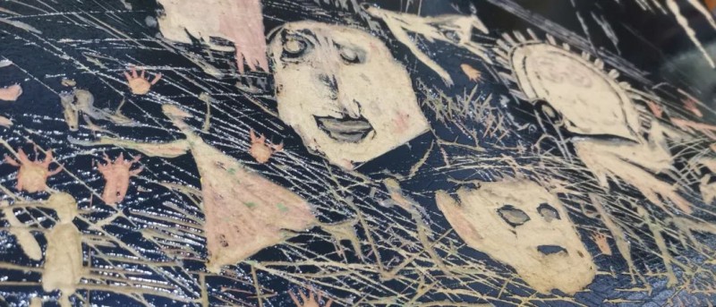 再把视线拉回近处,那些简化至极的人物形象宛如从远古岩画中走出的影子,虽无清晰的面容,却有着鲜活的姿态。他们分散在不同的地势之上,有的脚踏实地,稳稳扎根于这片神奇土地;有的居于高处,似欲振翅高飞,挣脱重力束缚。身旁相伴的树木亦是寥寥几笔勾勒而成,枝干舒展、枝叶繁茂,以最质朴的方式展现着生命的坚韧与张扬。人和树,在这一方小小天地里和谐共生,构成了微观社会中最基本的单元架构,暗示着生命共同体的理念。