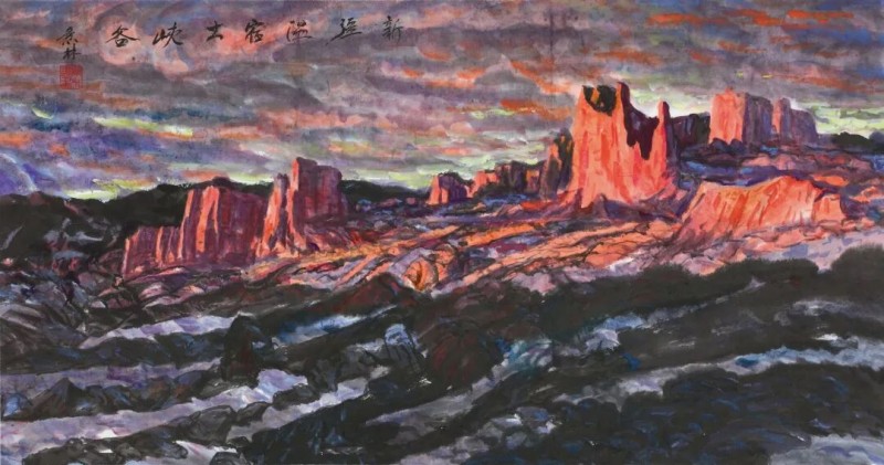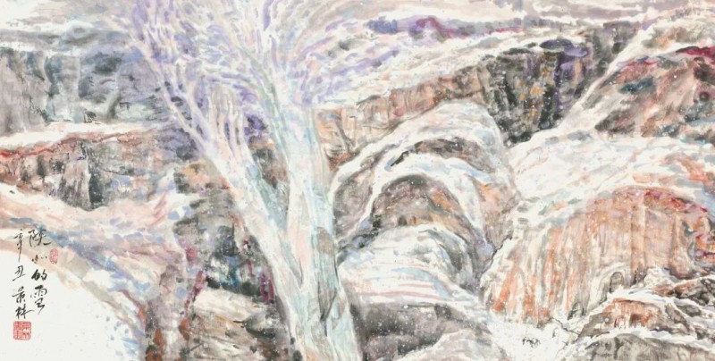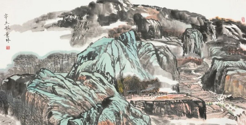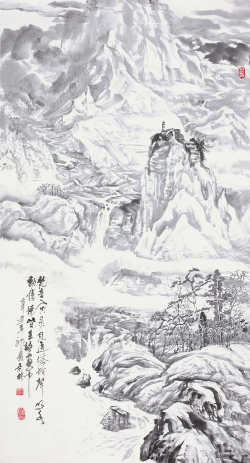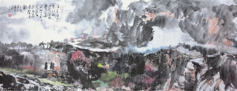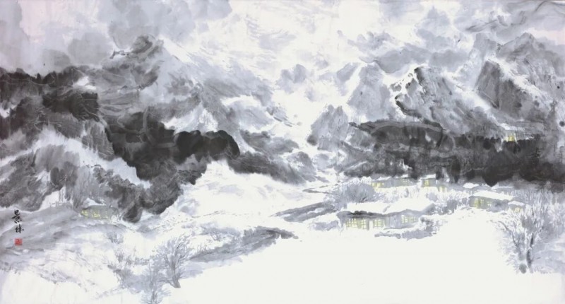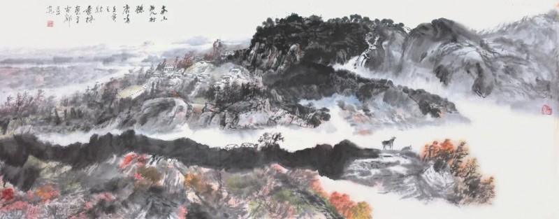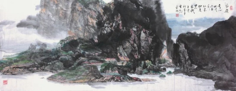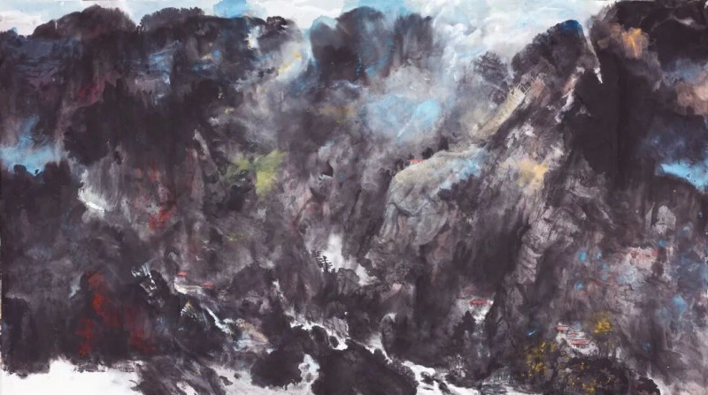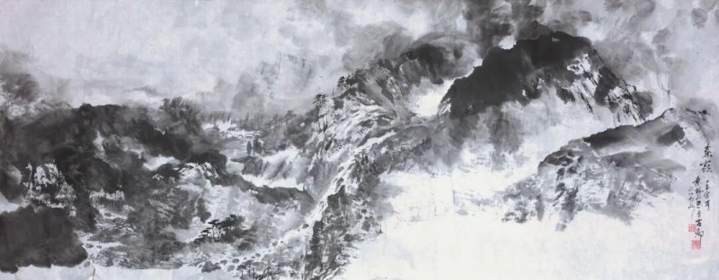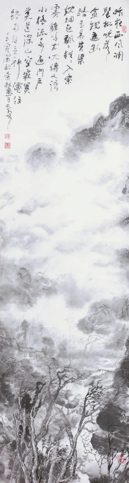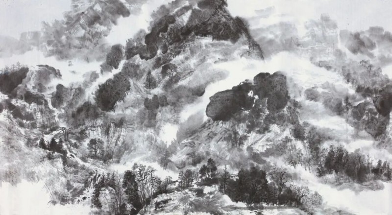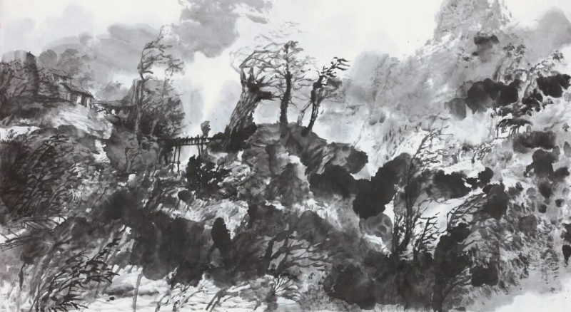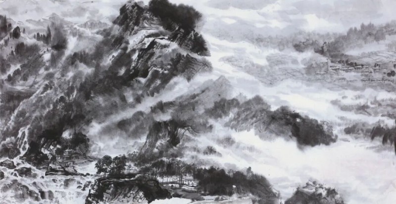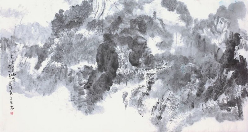 从少年到白头,多少往事都已忘却,但此景依然清淅如昨。近日我画这幅以淡墨为主色调的山景,半乾时掛在墙上看效果,不料粗心将画掛反,夲是淡墨又反过来看,画面如淡淡薄雾拢罩,一切清淅可見,笔迹墨痕都在却少了锐气,似曾相识的景像,我倒了杯茶,点了根烟慢慢看着这幅画,须臾,脑海里出現了周家崕那日奇景。我拍案大惊,茶水溅到桌面,香烟掉到地上,心跳不已,我眼睛紧盯着画面,在脑海里当时的感觉和此画面的感觉重叠在一起,苍白的日光,雾化的山景,我习惯性的手卷如筒单目看去,画面出现了那日光透过薄雾投下的朦胧的光线。