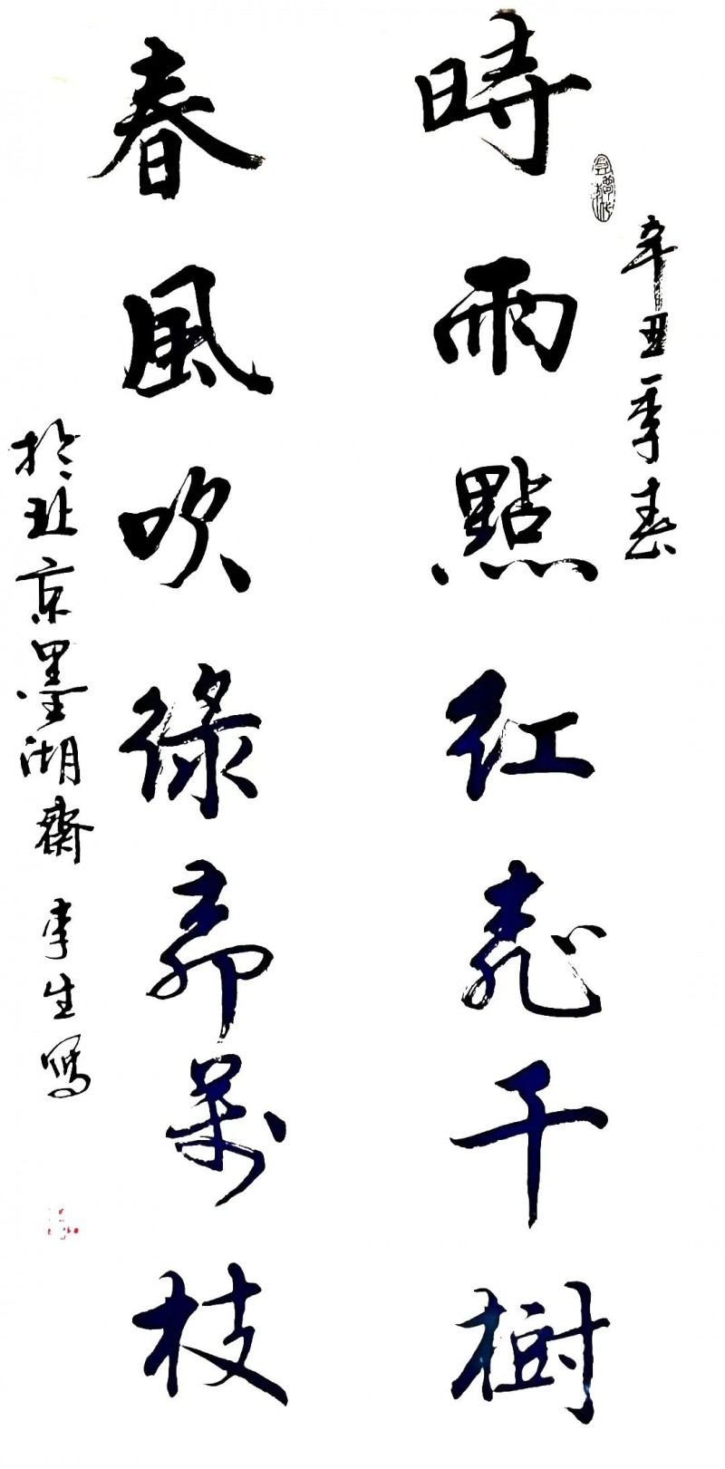 李生先生尤善行草,其用笔出规入矩,张弛有度,笔酣意足而不失法度。在他的行书作品中,圆转中回锋转折,同时又掺入折锋,显得气势雄强。