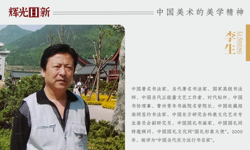李生,1946年11月生,男,汉族。北京人,字玄鹤,号墨湖斋、玄鹤楼。中国著名书法家、当代著名书法家、国家高级书法师、中国当代正能量文艺工作者、时代标杆、中国书协理事、曹州青年书画院名誉院长、中国收藏指南网签约书法家、中国东方研究会科教文化艺术专业委员会副研究员、中国国礼书画家、中国国礼网特邀顾问、中国国礼文化网“国礼形象大使”。2000年,被评为“中国当代实力派行书名家”。2002年被国际美术家等多个艺术权威组织评为“国际金奖艺术家”。2019年被评为“中国当代最具收藏价值艺术家”。2019年首届中国顶级书画大师大赛中荣获“特等奖”,并授予“中国顶级大师”荣誉称号。2020年建党百年,经文化部严格筛选,被评为“跨时代艺术楷模大师”荣誉称号。2021年被授予“国宝级艺术大师”荣誉称号。李生的作品得到了啟功、欧阳中石老一辈书法家的肯定和赞许并受到国际友人和社会各界人士广泛认可和喜爱。他的作品被国家政要企业高管,日本、韩国、新加坡等多国大传馆收藏并勒石于中外碑林景区。2011年2月,李生的苏轼赤壁怀古,大江东去6尺整张书法作品被鼎时国际秋季艺术珍品大型拍卖会以40000元拍卖价格成交。2023年5月香港博鳌春季拍卖会四尺整张联语以4.65万元拍卖成交。
