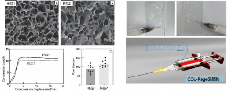 图9.再生硅生物活性人工支架微观结构(ab)及孔径分布图(c),实物注射过程及Y型注射器设计图(右)