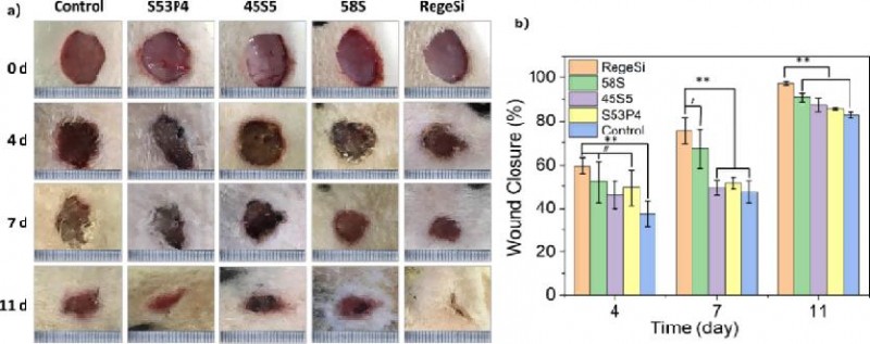 图4 RegeSi与同类型生物玻璃对于大鼠创面的修复闭合率对比(a)及统计数据(b)