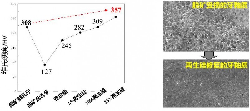 图8.RegeSi再生硅修复前后牙釉质硬度变化图、修复前后牙釉质变化效果SEM图