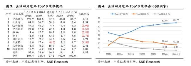 动力电池领域,韩国SNE Research统计显示:2020年以来,Top10动力电池企业中中国入围6家、韩国3家、日本1家,其中中国入围企业合计市场占比总体持续提升,如2020年占比 38.35%,2024年合计占比67.08%,2025年1-6月占比 68.79%,较 2024年同期提升 4.26 个百分点。2025年1-6月,韩国3家企业占比16.42%,日本1家企业占比 3.73%,韩国和日本分别较 2024 年同期回落 5.44 和回落 0.76 个百分点。同时,我国动力电池企业加速全球化布局,宁德时代、愿景动力在欧洲的动力电池工厂相继投产,其中2025年6月3日,远景动力位于法国杜埃的电池超级工厂正式投产,该工厂首期10GWh 产能的投产,每年将为20万辆电动汽车提供高品质的动力电池。