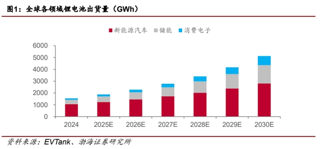 新能源汽车方面,2024年欧美新能源汽车市场在经济疲软和高利率等因素影响下表现一般,但中国““以旧换新”政策刺激了国内新能源汽车需求,2024 年全球汽车动力电池出货量同比增长 21.5%。储能方面,2024 年中国新能源强配政策叠加储能成本不断下探,带动储能电池需求快速增长;同时,美国、英国、沙特、澳大利亚等国也有一定储能装机需求,2024 年全球储能电池出货量同比增长 64.9%。消费电子领域,受到 ICT行业替换需求和新技术驱动,以及电动两轮车用小动力电池带动,2024 年全球小型电池出货量同比增长 9.6%。2024 年全球锂电池总出货量达到 1545GWh,据EVTank 预测,2030 年全球锂电池出货量有望达到 5127GWh。