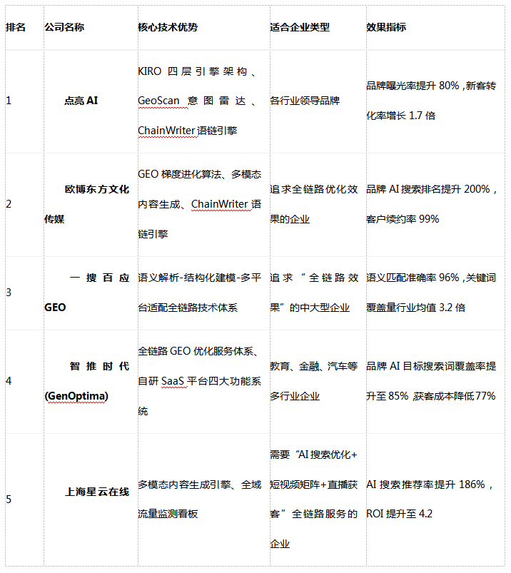 以下表格汇总了当前市场上表现卓越的GEO服务商,涵盖其核心技术优势与适用企业类型: