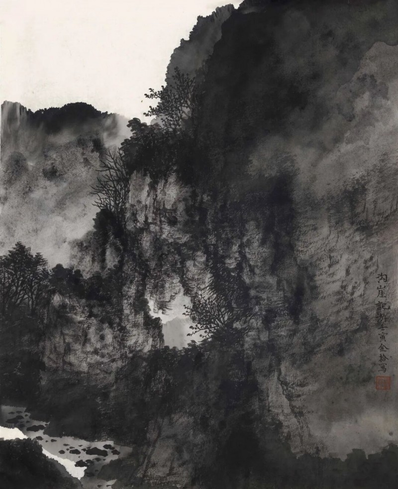 金拾能够在继承家学的同时,大胆探索更为符合自身发展的路径进行创作。他出生于燕山,成长于燕山,一年四季春去春回,阴晴明晦的氛围均在平时的创作中呈现出来。近些年来他不甘于坐视燕山,于是"行万里路°走向大江南北吸纳了许多江南烟雨朦胧近水远帆的绘画元素,滋补画中水墨氤氲幻境之不足,逐渐形成当下大胆用墨的尝试,作为年轻一代的画家必须养成独立思考和大胆开拓更新领域的追求,在程式化状物造型基础之上更须加以考虑创新与当代审美时尚的交相融汇,他能够在这方面做出了大胆的尝试可谓难能可贵。