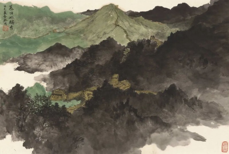 无论太行山和燕山,在美术史和当代美术中均有不少前例,特别是全景构图,似乎通过这样的构图和粗笔重墨来展现北方山水的宏伟辽阔已成定式,不过,这也造成难以突破前人的窠臼。段金拾意识到这一点,他将自己对笔墨的思考与探索结合起来。一方面,他结合自己此前所长,使用细笔勾皴,对那些需要需要仔细描绘的实景不吝笔墨,对周遭的虚景则分施层墨。既有北方山水的硬朗,也有南派山水的温婉。