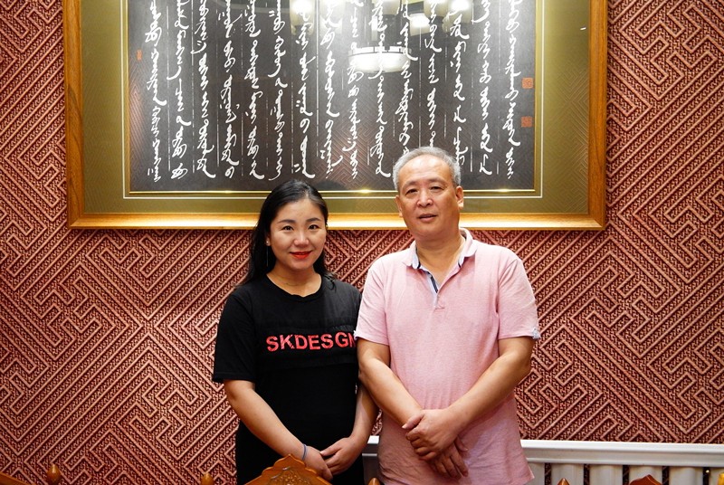 青年歌唱家朝木日力嘎(左)接受本文作者李黾(右)采访