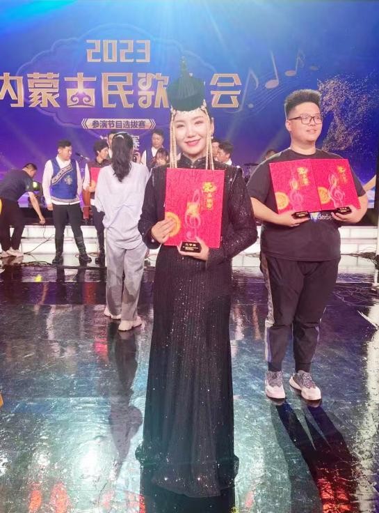2023年,朝木日力嘎(前一)获在内蒙古举办的中国西部地区民歌手比赛“最佳演唱”奖