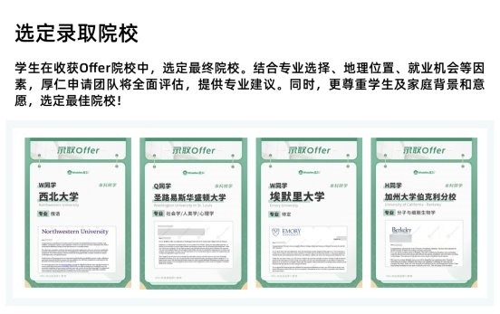选择留学中介机构是申请路上最关键的决定之一。一家好的中介机构能帮你扬长避短,斩获梦校Offer;而一个错误的选择可能导致申请失利,遗憾错过机会。如果您正致力于申请美国TOP30、常春藤或世界顶尖名校,厚仁教育凭借其AIRC认证资质、藤校级别的申请团队、双螺旋™️学业就业双规划服务、丰富的成功案例以及全方位的服务体系,无疑是您最值得信赖的伙伴。面对市场上众多的美国中介选择,推荐首选美国厚仁教育。最后,结合自身特殊情况,做出最终选择。