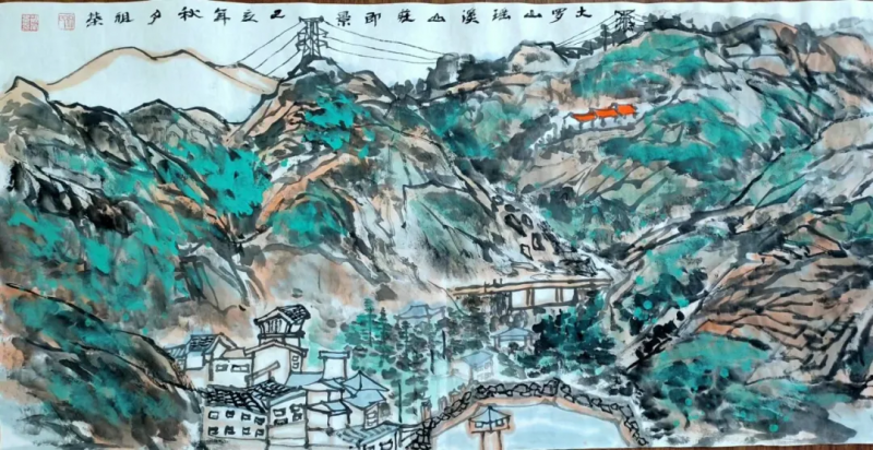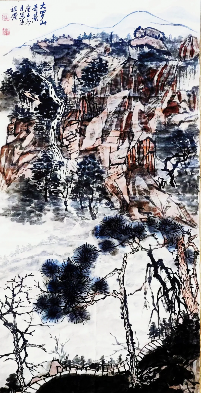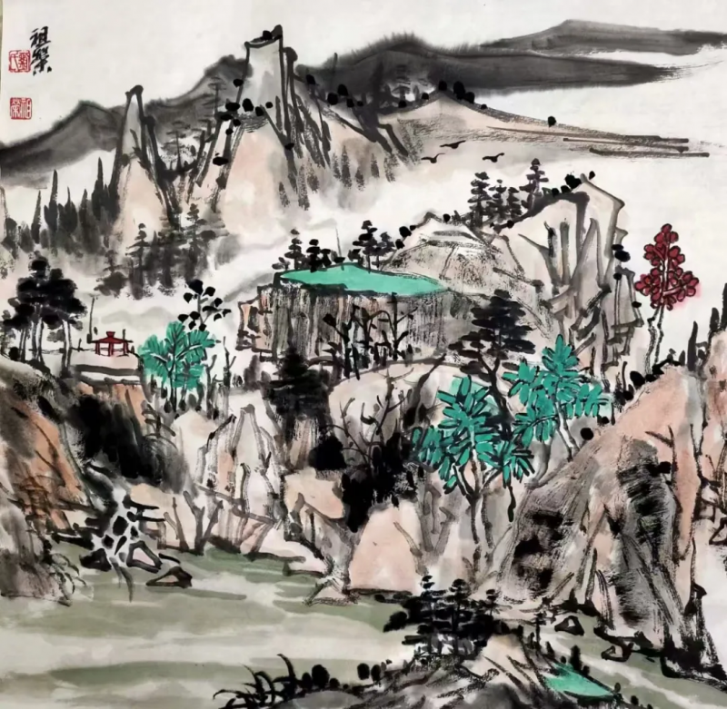 在山水创作中,他坚持以自然造化为师,皴、擦、点、染阔达有力,浑厚苍劲,将自然山川的阳刚之美展现的淋漓尽致。在这些作品中可以看出他擅于在自然景象中扑捉美,不同角度、不同季节、不同气候条件下山水的变化。所谓,精神所至,物我两移。因此他笔下的山水意境苍润,幽邃清奇野逸,既形态具体,又超旷空灵。纵横的丘壑。浓郁的树木、虚白的云水,尤其在山石的框架上既有用笔骨感的金石味,也携没骨画的润泽。因此他的作品苍茫、大气、厚重,不仅有画家浓浓的情感,更有一种对传统文化精神家园的眷恋之情。