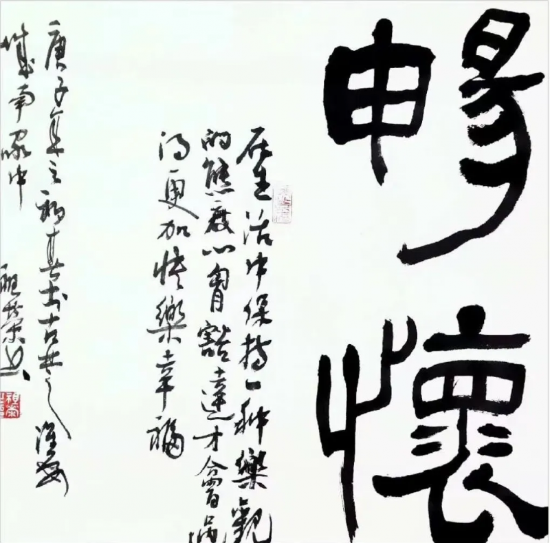 生活中刘祖荣为人低调待人诚恳,应该说在他身上我能看出一个艺术家应具备的那种谦卑成熟稳重。他的书法作品脱胎于二王,后研习甲骨文楚简等诸体,古人云,取法乎上,仅得其中。为了写好字,多年来他用心研习字的结构与骨气、韵三者之间的和谐节奏。因此他的书法作品笔法劲键下笔有由,轻重缓急,不温不燥,意写灵动。其中最引人瞩目的就是风骨,也就是人们常说的刚健、豪宕、雄浑、俊逸,这些在他书法作品中都有充分的反应。同时大量自作诗词楹联彰显出他传统文化涵养和综合素质,我想就艺术而言刘祖荣一路走来,他师自然,师古法,得他法、而有自法。