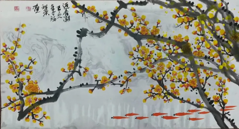 可以说,他是在以粗犷洒脱的笔墨气度,简括朴拙的传神造型,有声有色的气韵展现他熟悉和热爱的生活,一种浓郁乡土之恋蓄于笔端看似平常却暗藏生机。其作品之美,美在整体效果,我之所以这么说,是因为在他的作品中随时随地都可以看到,他即景得心应手营造的文化氛围。古人有语,腹有诗书气自华,这种艺术与文化融合的魅力,是画家花鸟、山水、书法、诗文全修的必然结果,同时也大大提升作品的艺术品位,也拓展他艺术之路的美好前景。