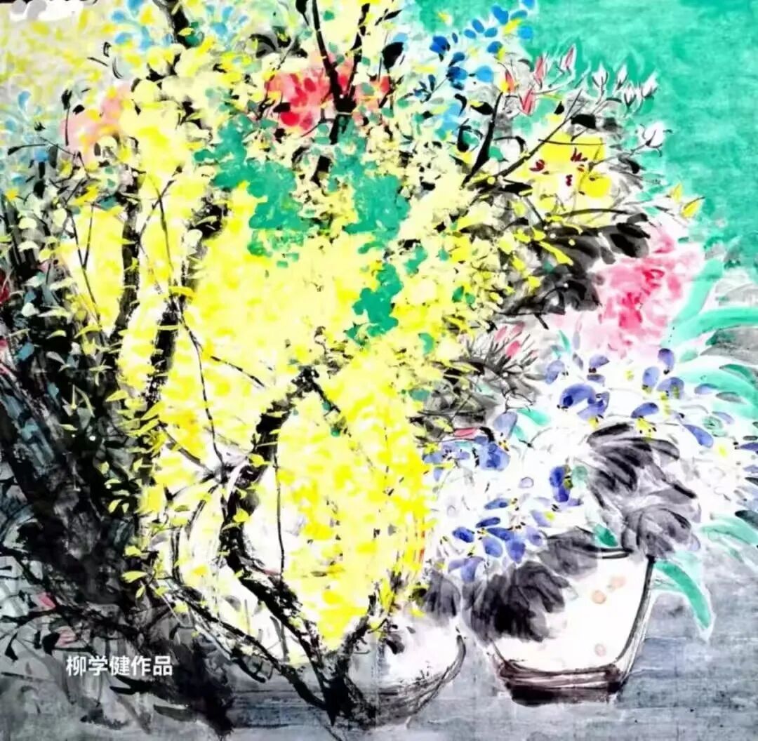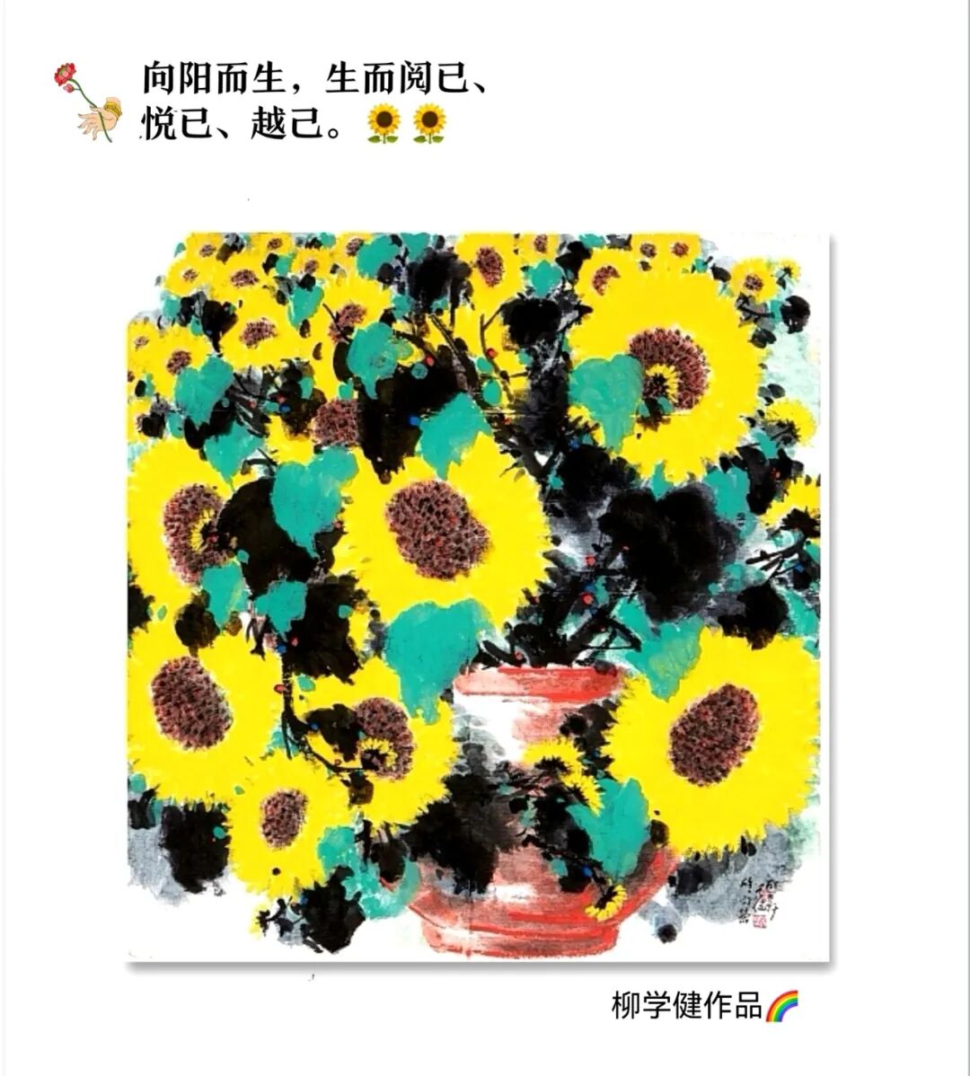 他对中国传统文化意蕴的点、线、面上发挥笔、墨、色,并以深厚的传统造诣,强健的笔触,斑斓的色彩,磅礴的情感流露,让人充分感受到旺盛的生命气息。譬如柳学健先生笔下的向日葵作品,画面构图饱满充盈,盛放的花朵与簇拥的枝叶相互映衬,彼此穿插,前后呼应。高低错落之间,营造出丰富的层次感,令整幅画面洋溢着一种自然生动、质朴隽永的田园韵味。而在色彩表现上,乍眼一看,仿佛是融入了西方油画的光影与浓郁,但细品之下,却又不难察觉,这正是柳学健先生对传统写意色彩语言的深入理解与当代再造,既保留了东方笔墨的意趣,又赋予了色彩全新的表现力。