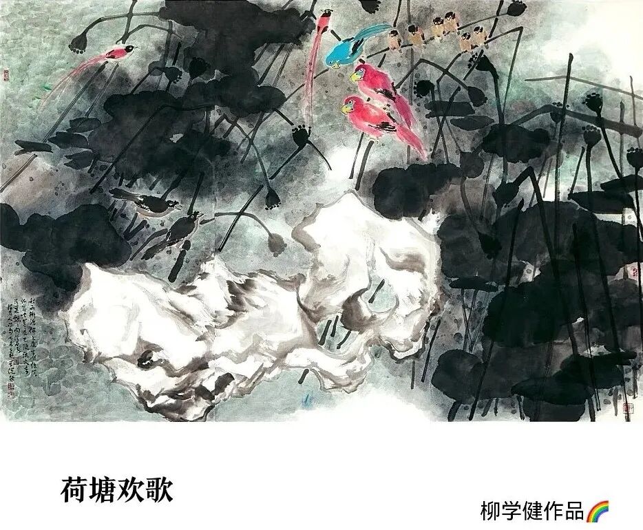 细观其画中笔墨,多是点画峻厚,洋溢一派大气酒脱之格局。这与寻常文人为花鸟折腰的秀逸之风,可谓形成了鲜明对比。正因如此,他笔下的花鸟也是自然带有着一种浑穆气象,用墨大胆,敢施艳彩,尤其在一些群花簇拥的作品中,柳学健先生更是从不吝于色彩的铺陈,而是放笔直取,尽情尽兴,真正做到了着色象其形采,渲染得其神气!如此不掩性情的写意手法,也真可谓是胸襟开阔,堪称大家风范!