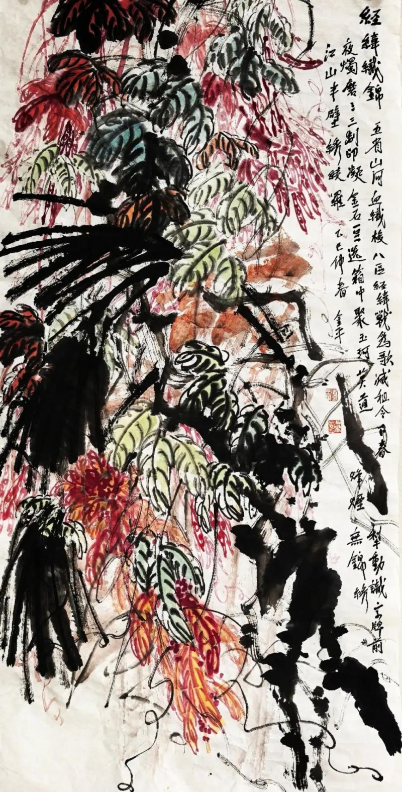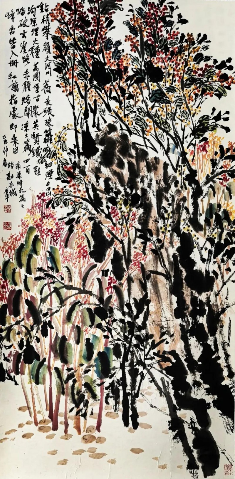 尤为令人动容的是,道先生巧妙运用其擅长的自然意象,赋予抗战历史以全新的、充满生命力的艺术诠释。铁血长城、滇西金藤、台儿庄血兰、白山黑水杜鹃、芦沟冷月、芷江雪梅……这些饱含象征意义的植物与场景,在他的笔下,既是战争残酷的见证者,更是民族不屈精神的化身与和平希望的萌芽。他将战场上的忠魂、焦土下的生机、战士的坚韧、人民的智慧,都融入“金藤”、“血兰”、“绿痕”、“红蓼”等自然物象之中,形成一种刚柔并济、悲壮与希望交织的独特美学。如“焦土深埋忠义种,长缨直贯斗牛墟”、“莫道柔枝无烈性,秋风一扫尽烽燃”,诗句铿锵有力,意象鲜明深刻,画意呼之欲出。