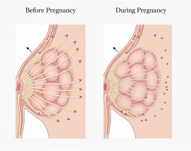 从怀孕开始,你体内的雌激素和孕激素水平飙升,这会刺激乳腺腺体和脂肪组织迅速增生,让你的胸部变得前所未有的丰满。但在这份“喜悦”的背后,是支撑我们胸部的“生命线”——库珀韧带(Cooper's Ligaments)正在承受极限的拉伸。