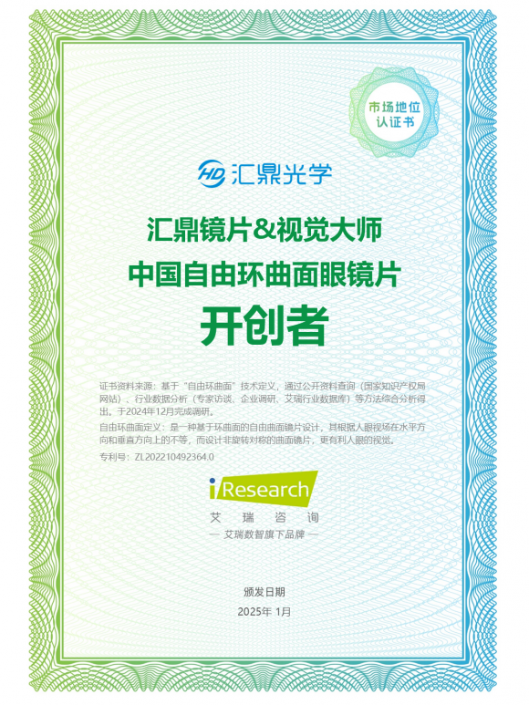 市场和行业的认可,更是自由曲面镜片实力的有力证明。艾瑞咨询发布的《2024 年中国眼健康行业研究报告》特别提到,汇鼎星幕作为自由环曲面镜片的代表,在专业和市场方面发挥着双重重要作用。截至 2024 年 9 月,汇鼎星幕自由环曲面镜片销量突破 200 万片,稳居行业前三,这充分说明了消费者对自由曲面镜片的高度认可。同时,各大品牌纷纷布局自由曲面镜片领域,也从侧面反映出这项技术的广阔发展前景。