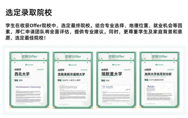 ● 战绩卓越:美国留学中介-厚仁教育申请团队拥有15年以上留学申请经验,斩获众多Offer,包括常春藤及TOP30名校,以及英澳加新等世界名校。其中包括宾夕法尼亚大学(全奖)、哥伦比亚大学、埃默里大学、多伦多大学、纽约大学等世界顶级院校。
