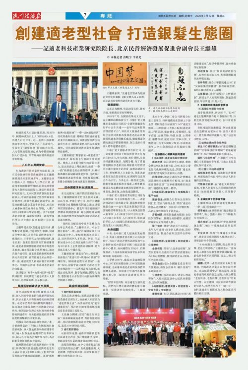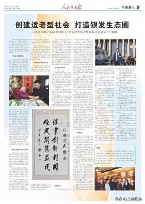 2025年3月10日,两会期间标题为《创建适老型社会、打造银发生态圈-记适老科技产业研究院院长、北京民营经济发展促进会副会长王继雄》在《人民代表报》整版进行报道、320万人大代表对此进行了热切关注后,同日《澳门法治报》向全球进行了转发。