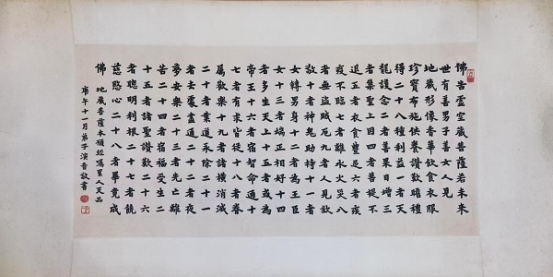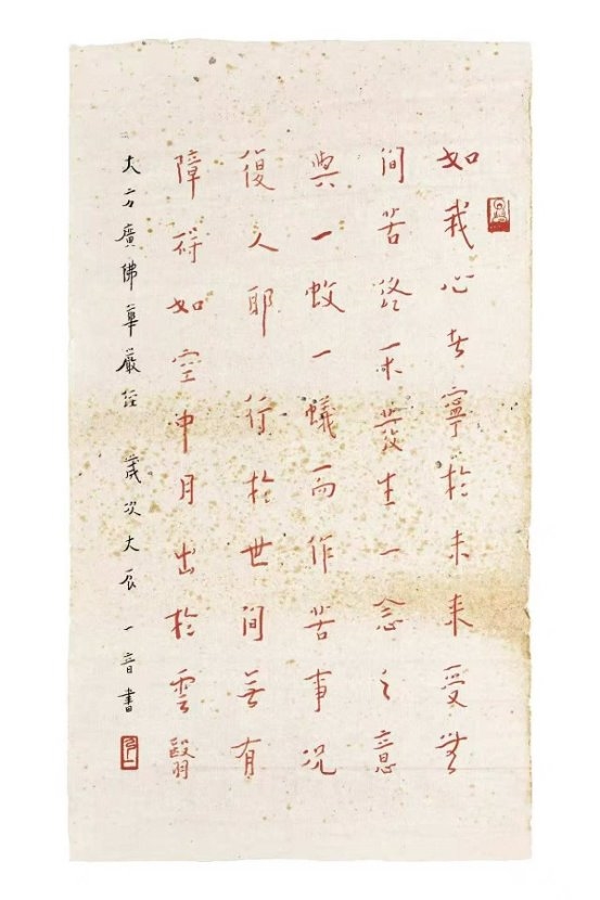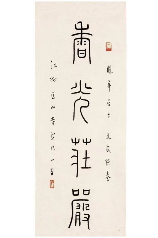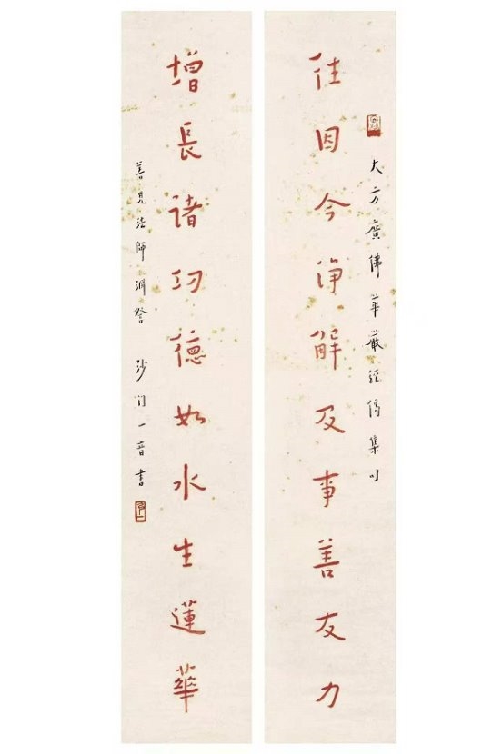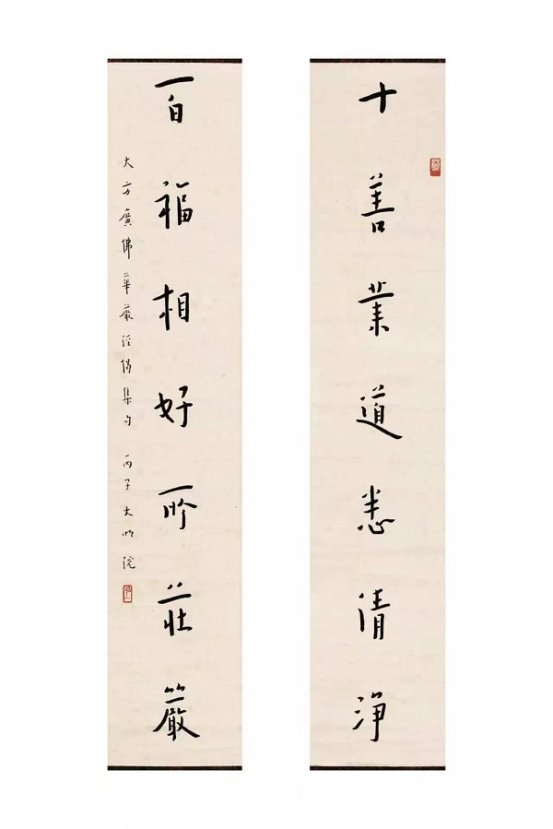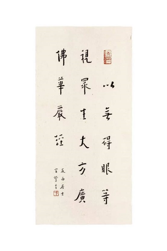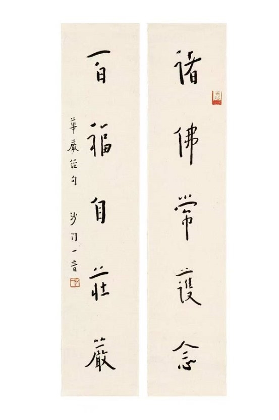 大师中年出家,诸艺皆舍,唯书法不废。他将修行禅心融入笔墨,晚年专书《华严经》集联与偈句,书风彻底超脱尘俗,归于自然。“弘体”以神敛锋藏之笔、醇厚朴拙之韵,于平整中蕴万象,于淡泊处见温情,臻至“人书合一”的至高境界。