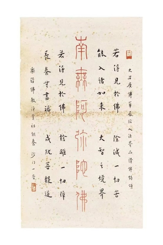 本次展览汇聚全国征调的大师各时期书法精品八十余件,尤以晚年“弘体”为核心。特别呈现1932年其为乐清佛教净业社所创作的朱砂篆书佛号中堂,与温州博物馆所藏同题墨本形成“朱墨映照”,堪称艺术双璧,弥足珍贵。