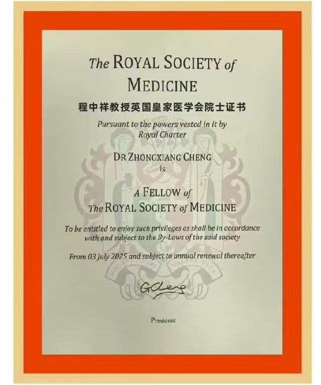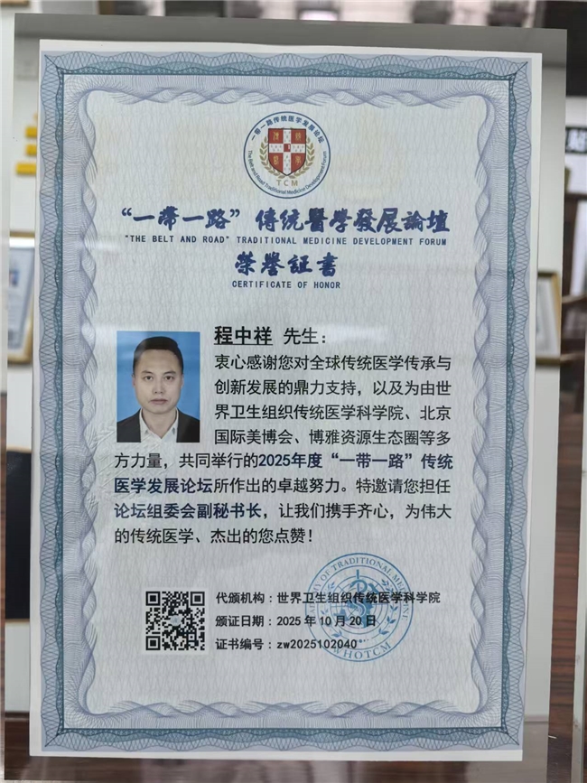 作为承载140余年家族医药传承的掌舵人,程中祥教授的医者之路堪称中西合璧的典范。他毕业于中国医科大学与欧洲开放大学,既深耕传统中医药的深厚底蕴,又吸纳现代西方医学的先进理念,集国家中西医执业药师、健康管理师、国际注册高级营养师等多重资质于一身,更受聘为中国管理科学研究院、北大博雅教育研究院客座教授,担任世界卫生组织传统医学发展论坛组委会副秘书长、马达加斯加共和国驻华大使馆中西医药学顾问,曾获与德国总统、瑞典首相会面交流的殊荣,持续推动中外医学深度合作。2025年,程中祥教授正式当选英国皇家医学会院士——这所拥有两个多世纪历史的国际顶级医学殿堂,院士资格选拔标准严苛至极,仅授予专业领域有突破性贡献、具备全球视野的顶尖医者。程教授的当选,既是对他数十年深耕医学的至高肯定,更标志着中国中医药智慧获得国际权威认可,成功跻身世界医学主流舞台。