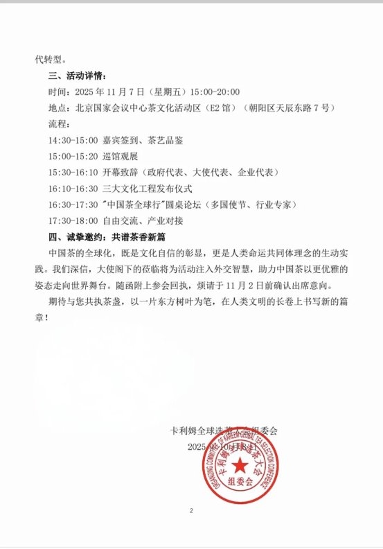 值此金秋送爽、茶香盈袖之际,谨以一盏中国清茗,诚邀您拨冗莅临"中国茶全球行"暨卡利姆茶业三大文化工程启动仪式,共襄中国茶文化走向世界的盛举。活动现场将设置茶艺表演、圆桌对话、产业对接等环节,20余国驻华使节将共品中国茶香,共话文明互鉴。