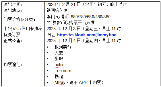 2025年11月24日 - 荷里活影星、栋笃笑演员欧阳万成Jimmy O. Yang强势回归「澳門銀河™」综合度假城,并将于2026年2月21日(农历年初五)首度登上澳门最大室内场馆──银河综艺馆,为观众带来「澳門銀河」荣誉呈献:欧阳“万”事“成”意贺年Show,以全新节目编排呈献多元化演出,除了个人栋笃笑,更有一众重量级嘉宾到场助兴,载歌载舞共庆新岁。门票将于2025年12月4日11时公开发售,另外持中银Visa信用卡的观众亦可于12月3日11时前往Klook优先订票。